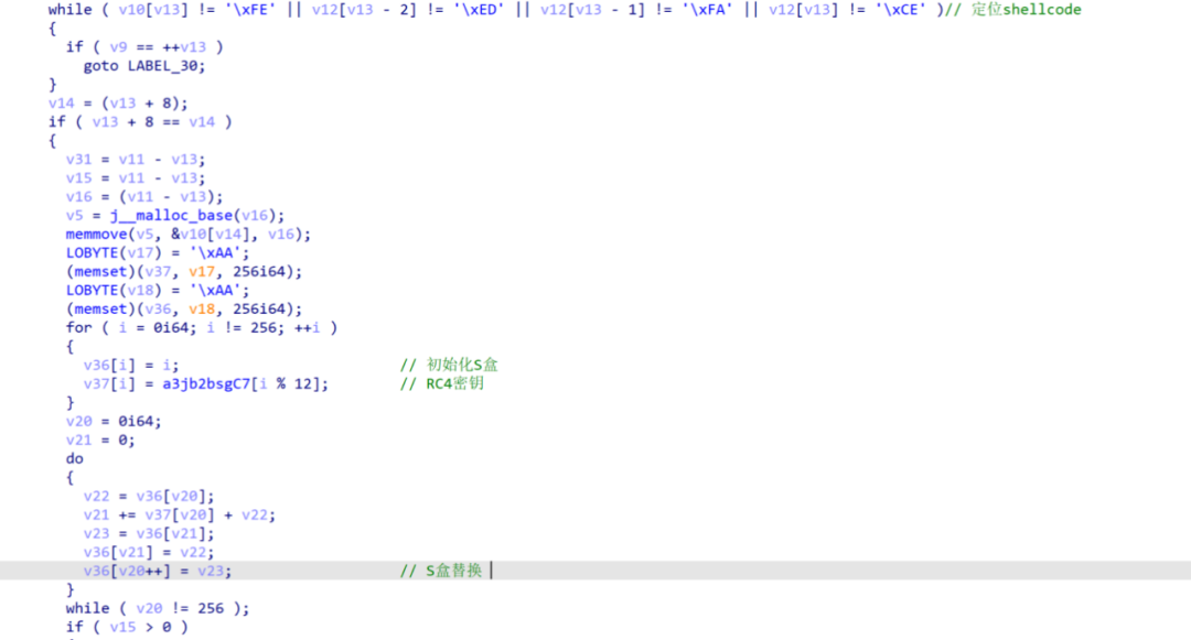 随后定位shellcode,shellcode使用RC4算法进行了加密,密钥为3jB(2bsG#@c7。