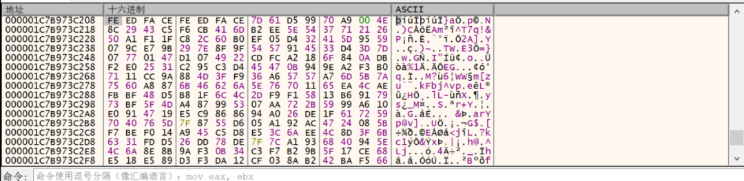 如下图所示,shellcode由8字节\xFE\xED\xFA\xCE\xFE\xED\xFA\xCE定位,后续0x43B08字节为其shellcode。