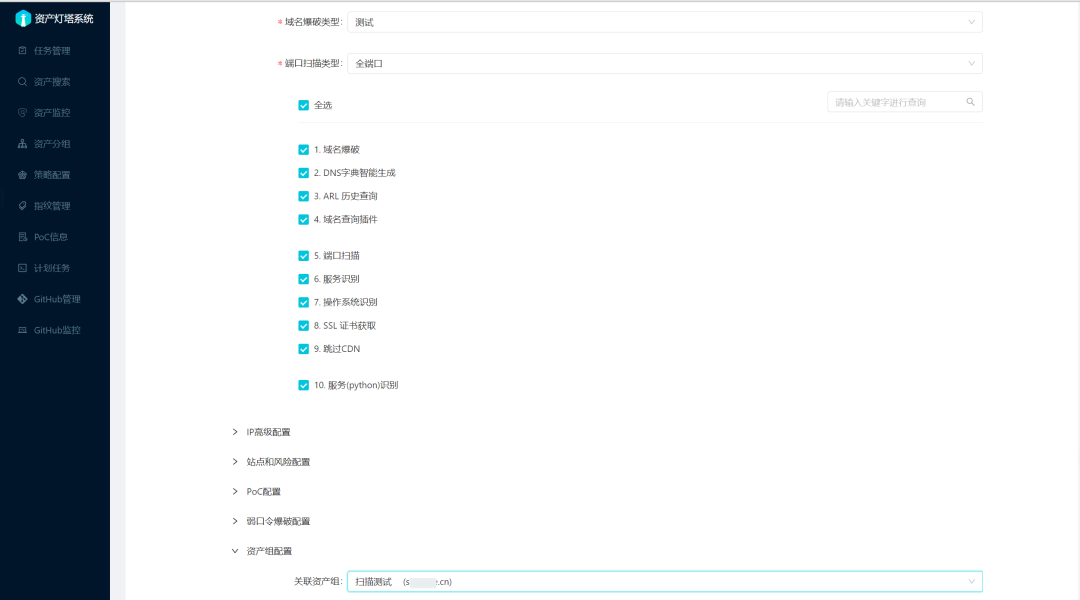 创建一个扫描策略,全都选择了,这里域名爆破和端口选大字典和全端口,这里测试我就选了测试小字典。