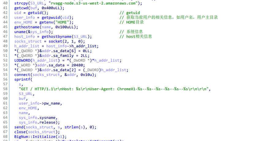 对该恶意软件进行反汇编分析。该恶意文件的功能是收集执行该文件的用户信息以及系统相关信息,并通过User-Agent字段发送给了攻击者所接管的S3 Bucket。