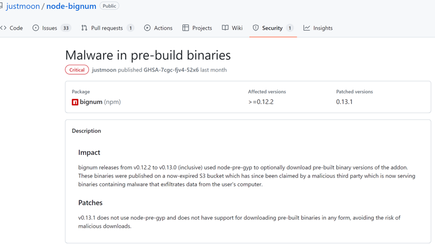 GitHub Advisory Database(GAD)报告 v0.12.2 到 v0.13.0版本的 bignum 包使用 node-pre-gyp 下载预构建的二进制版本。这些二进制文件发布在一个现已过期的 S3 Bucket上,该Bucket已被恶意第三方占用,用户安装bignum时会下载恶意的二进制文件,这些恶意软件会从用户计算机中窃取数据。