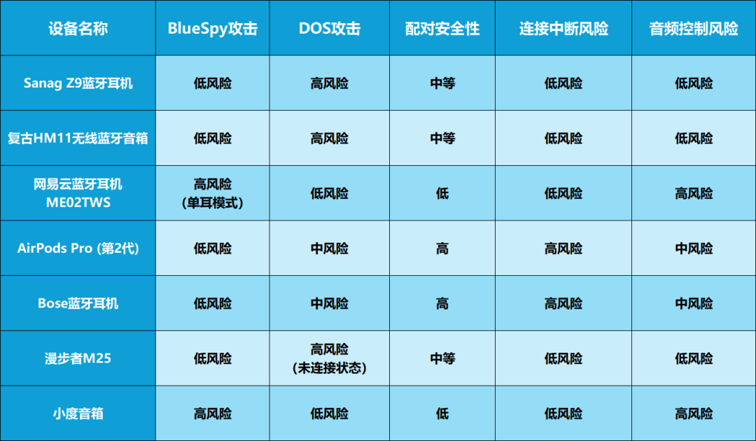 1. 设备安全性差异显著: 不同设备对BlueSpy和Dos攻击的抵抗能力各不相同。部分设备(如网易云耳机、小度音箱、小度智能屏)在某些情况下表现出较高的安全风险。