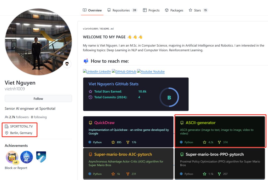 从视频57秒处的截图也可以看出,这个开源项目是直接通过Zip包下载后执行的,目录名称是ASCII-generator-master。根据GitHub的公开资料显示,这个项目的作者和维护者来自德国柏林,是德国WIGE传媒集团旗下sporttotal.tv的一名资深AI工程师。