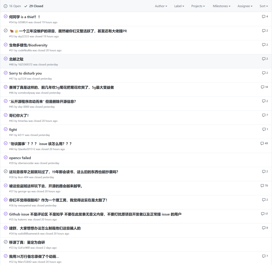 事件之后,许多人在ASCII-generator发布issues,这个原本用于反馈项目问题(建议、缺陷)的地方被当作了起哄的论坛,涌入了不少针对何同学的issues,在一些用户的提醒下,作者关闭了这些issues,这个行为类似在《黑神话 • 悟空》的steam社区中键政,在故宫的墙壁上刻上“王小娟我爱你”,在停车场里占着三个不属于自己的车位。