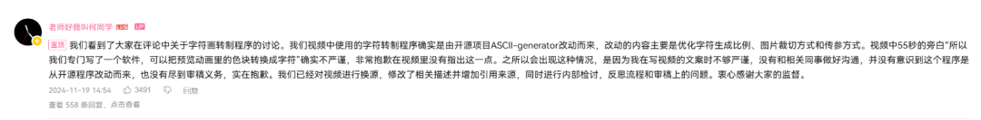 说是争议其实不合适,因为这次舆论的焦点几乎是一边倒地指责何同学犯下的低级错误,因为在这则视频的原始版本的55秒处,何同学介绍说“我们专门写了一个软件,可以把预览动画里面的色块转换成字符”,作为有上千万关注者的UP主,这个说法自然会被注意到,于是很快有人发现这款所谓“专门写的软件”其实是直接用的GitHub上的开源项目: