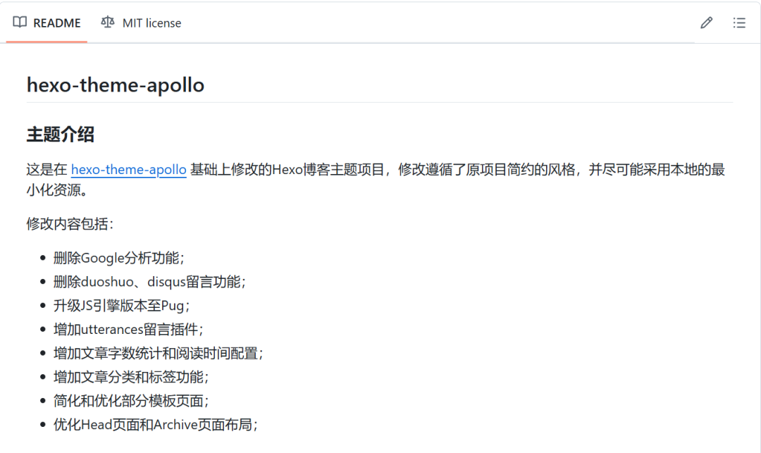 不管协议多么宽松,保留原作者的版权声明是使用开源代码的基本要求。这通常包括在代码文件中保留许可证文本或在项目文档中注明出处。比如下图是笔者基于另一个开源项目做的修改(https://github.com/repoog/hexo-theme-apollo ),即便原作者已经将项目归档(Archive),不再继续维护。