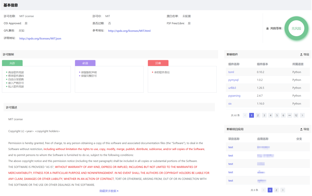 SCA的全称是Software Composition Analysis(软件成分分析),这类工具或产品可以帮助企业识别其软件项目中使用的开源组件,并评估这些组件的安全性、许可证合规性和质量状况,使企业能够主动管理开源组件的使用,降低安全和法律风险。正如下图所示的那样,它可以更清晰的、一目了然的看到开源协议的许可限制,图中的风险等级是无风险,主要是指商用方面的风险,可能产品方也没有预料到版权声明是如此重要。