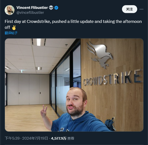 一名叫Vincent Flibustier的人发布图片和视频,称自己作为CrowdStrike的员工,在上班第一天因为发布了一个文件更新而被公司开除,说公司告诉他周五不发版,但他觉得自己是在周四发布的更新,算不得违反公司规定,被开除实在非常冤枉。