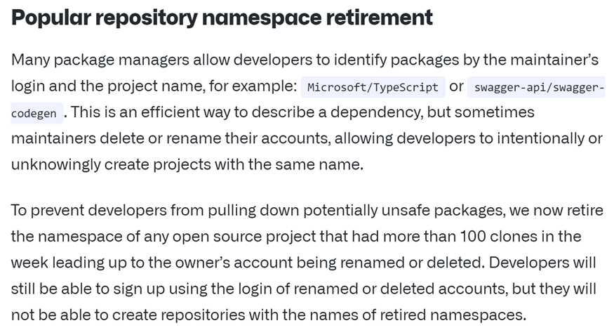 为了防止开发者下载潜在不安全的软件包,GitHub现在会停用在拥有者的帐户重命名或删除之前一周内克隆次数超过100次的任何开源项目的命名空间。开发者仍然可以使用被重命名或删除的帐户的登录名进行注册,但他们将无法创建与被停用命名空间相同的仓库名称。