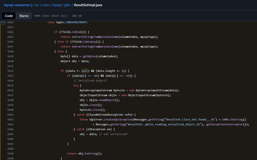 该漏洞的问题出在src/com/mysql/jdbc/ResultSetImpl.java的第3432行代码(https://github.com/mysql/mysql-connector-j/blob/402933ef52cad9aa82624e80acbea46e3a701ce6/src/com/mysql/jdbc/ResultSetImpl.java#L3422-L3450 ),这段代码位于getNativeConvertToString方法中,这个方法作用是用来转换数据库中存储的原生数据,并将它展示返回给应用,所以在数据转换前需要做数据类型判断。