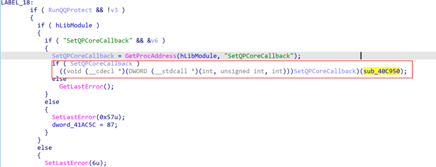 该段代码存在于函数sub_40C950内。函数sub_40C950会在QQProtect.exe执行时作为QPCore的回调函数。