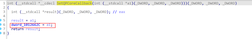 查看SetQPCoreCallback函数,其位于QQProtectEngine.dll文件中。发现QPCore的回调函数被保存在了全局变量dword_1012662C中。