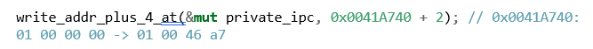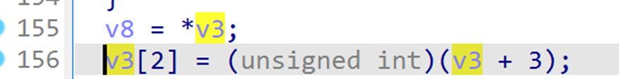 随后通过以下代码改变0x0041A740处的值,也就是上述的全局变量DWORD的值。这里write_addr_plus_4_at内部代码处理地址-8,是为了对应上述的v3[2]=(unsigned int)(v3+3)。于是0x0041A742开始的DWORD变成了0x0041A746,由于intel是小端序,所以0x0041A740处变成了01 00 46 A7。