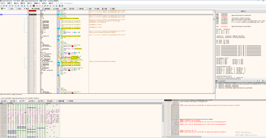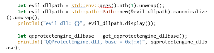首先通过以下代码获取evil.dll的路径和QQProtectEngine.dll的基址,由于QQProtectEngine.dll开启了ASLR,所以建议使用虚拟机保存快照进行漏洞复现,不然可能会造成利用成功一次便无法再次复现。这里加载QQProtectEngine.dll并非是为了使用,而是为了获取其基址编写真正我们需要攻击的QQProtect.exe的exp。