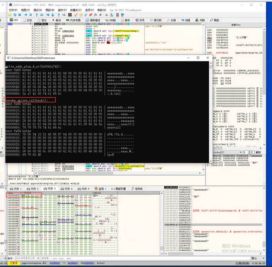 在这之后就是触发QPCore的回调函数,来覆盖QPCore的回调函数地址。如下述代码,qqprotectengine_dllbase + 0x12662C - 3为了只让A7一个字节覆盖,这时候QPCore的回调函数地址为0x0040C9A7。