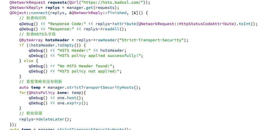 下述代码为使用QNetworkAccessManager对象发起HTTPS请求,该网站以HTTPS请求的时候会返回Strict-Transport-Security响应头。Qt会隐式的调用QHstsHeaderParser类解析HSTS header随后更新QHstsCache中的策略。
