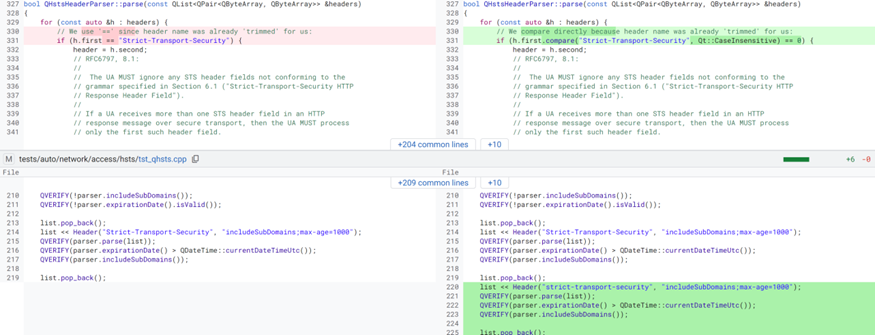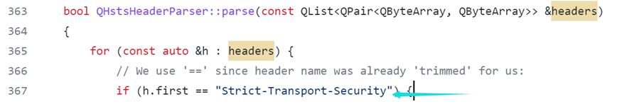 Qt是一个开源的软件,可以去定位相关的代码,笔者在netword/access/qhsts.cpp中发现了产生漏洞的代码。代码使用了==将响应头字段与Strict-Transport-security进行了比较,导致了大小写不匹配时,HSTS策略引入失败。