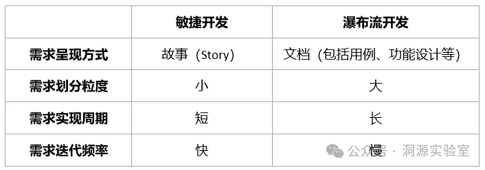 当前的软件开发流程,多以敏捷开发为主,部分行业和公司还有使用瀑布流开发,或双模IT(即敏捷开发和瀑布流开发并行)。敏捷开发和瀑布流开发在需求部分工作的区别如下: