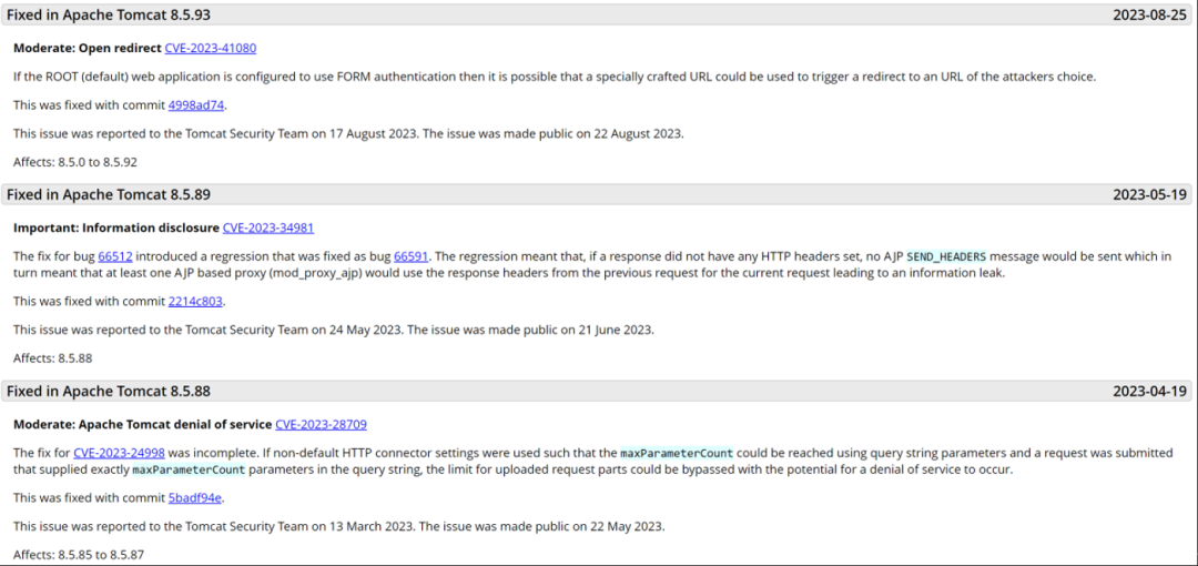 通常一个漏洞得到及时反馈和厂商响应,会有针对漏洞的产品更新或版本更新,对于受影响的企业而言,通用修复方案是将漏洞版本的提升至漏洞不存在的版本,修复版本一般可以从NVD或组件官网上得知。
