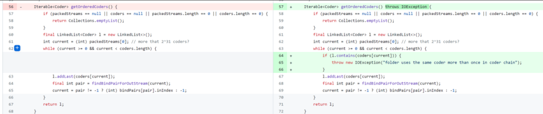 根据上图的代码差异,发现漏洞补丁是对于数组的成员进行了校验,校验语句是l.contains(coders[current]),而漏洞信息说明该漏洞是一个无限循环漏洞,可以猜想,其漏洞成因可能是该while循环会无限制的迭代,也就是通过逆向推导,该漏洞因current未校验导致无限循环。