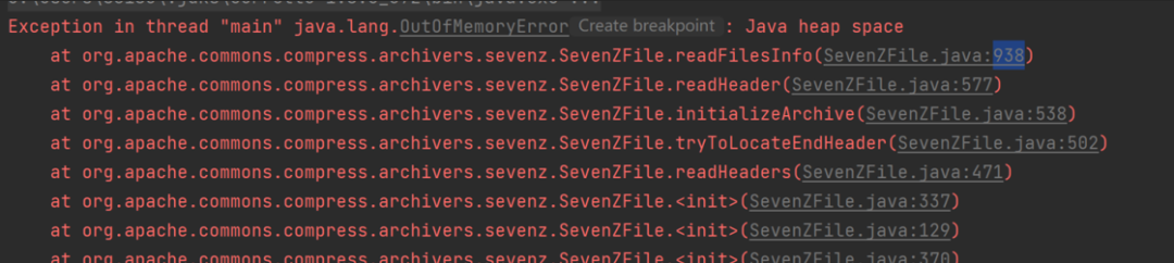 对于DoS等拒绝服务的漏洞可以通过调用函数查看是否Java出现异常来判断,下图是一个内存耗尽漏洞的报错示例。