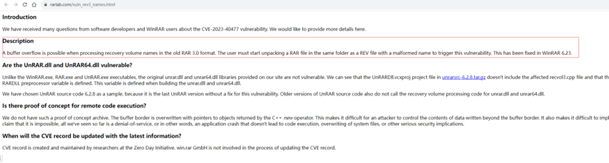 从rarlab上能得到更多信息,如发生的漏洞是处理RAR 3.0格式,触发的漏洞条件是解压与格式错误的rev文件同一目录下的rar文件。