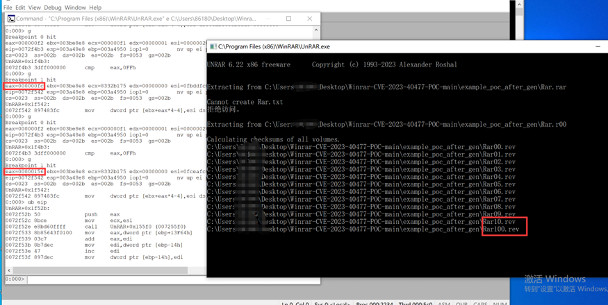 该漏洞存在于Winrar6.23版本之前。此漏洞是由用户解压RAR3.0格式的压缩文件造成的,该压缩文件目录下要存在恶意构造的.rev后缀名的恢复卷。